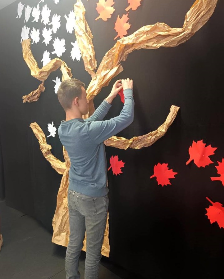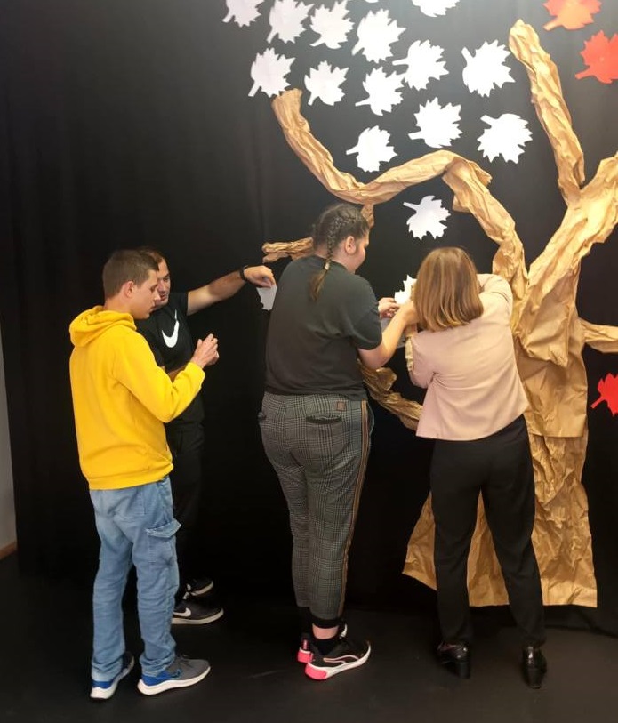 W dniu 6 listopada br. o godzinie 10.00 uczniowie naszej szkoły zebrali się w sali gimnastycznej, aby uczestniczyć w warsztatach „Patriotyczne drzewo”. Wszyscy wycinali liście w biało - czerwonych barwach i przyczepiali je do papierowego drzewa. Następnie pozowali do wspólnego zdjęcia na tle „patriotycznego drzewa”.
